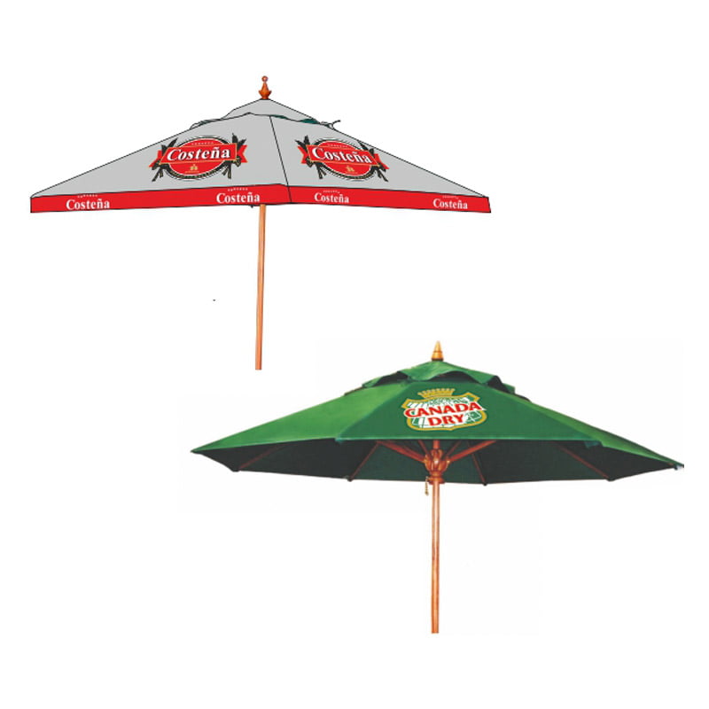 -Sombrilla Octogonal de 2.50 cm de diámetro -Estructura en madera -Costura e hilos polimatic -Logotipos estampados en screen con tintas plastisol